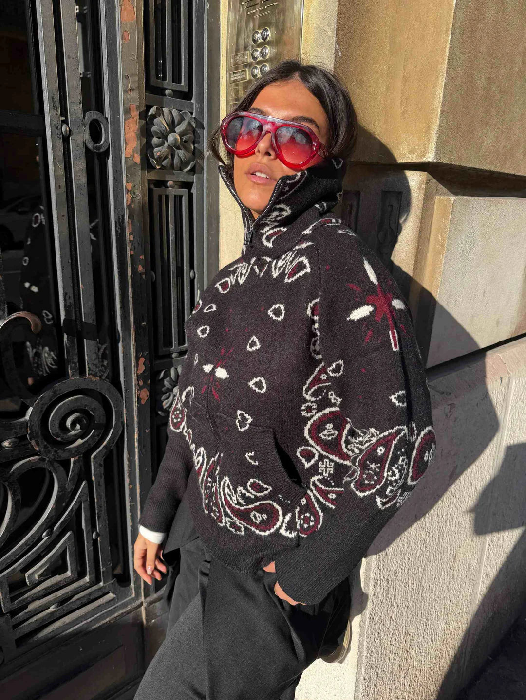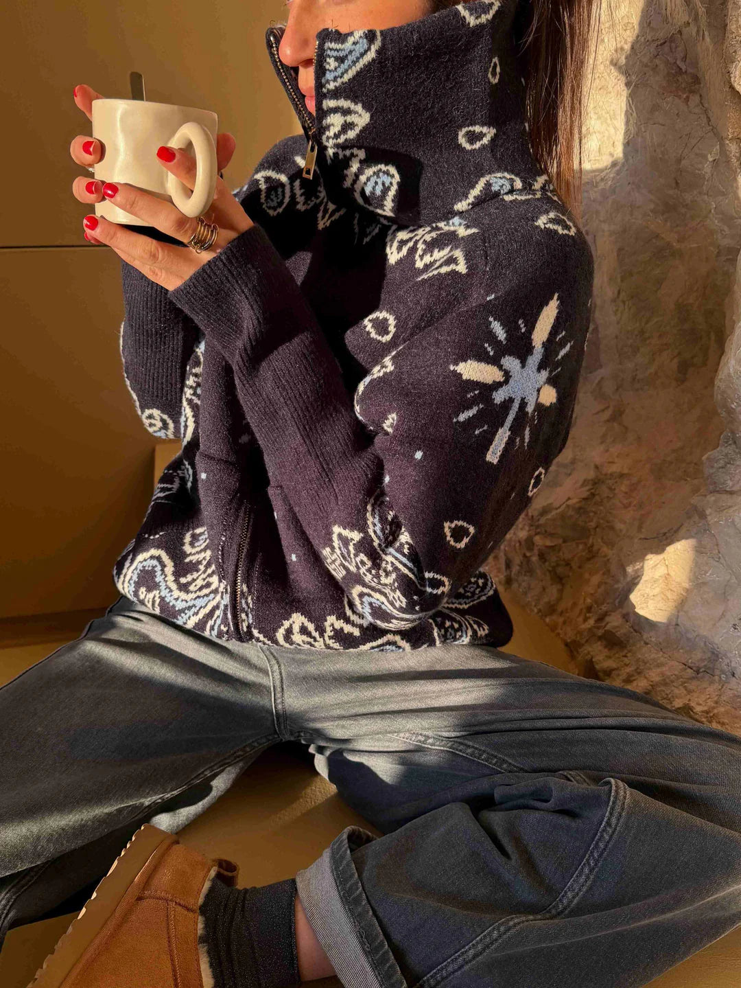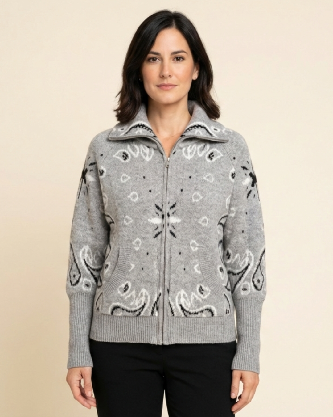 Aitana es un jersey de punto pensado para quienes buscan comodidad, abrigo y un estilo con personalidad. Su diseño con cuello alto y cremallera frontal permite adaptarlo fácilmente a distintos looks y temperaturas, mientras que el estampado tipo bandana le da un aire actual y distintivo. Perfecto para la temporada y para llevar tanto en planes relajados como en looks más cuidados, siempre favoreciendo la silueta.