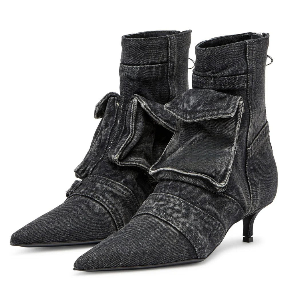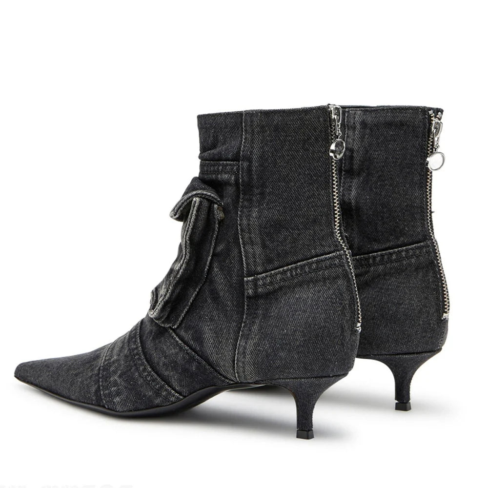 Confeccionados en tejido tejano de alta calidad, los botines Vega destacan por su diseño inspirado en el estilo cargo, combinando moda y originalidad a partes iguales. Su puntera esculpida y el detalle de bolsillo aportan un aire moderno y atrevido, mientras que la suela acolchada con soporte para el arco ofrece comodidad sin renunciar a la elegancia.